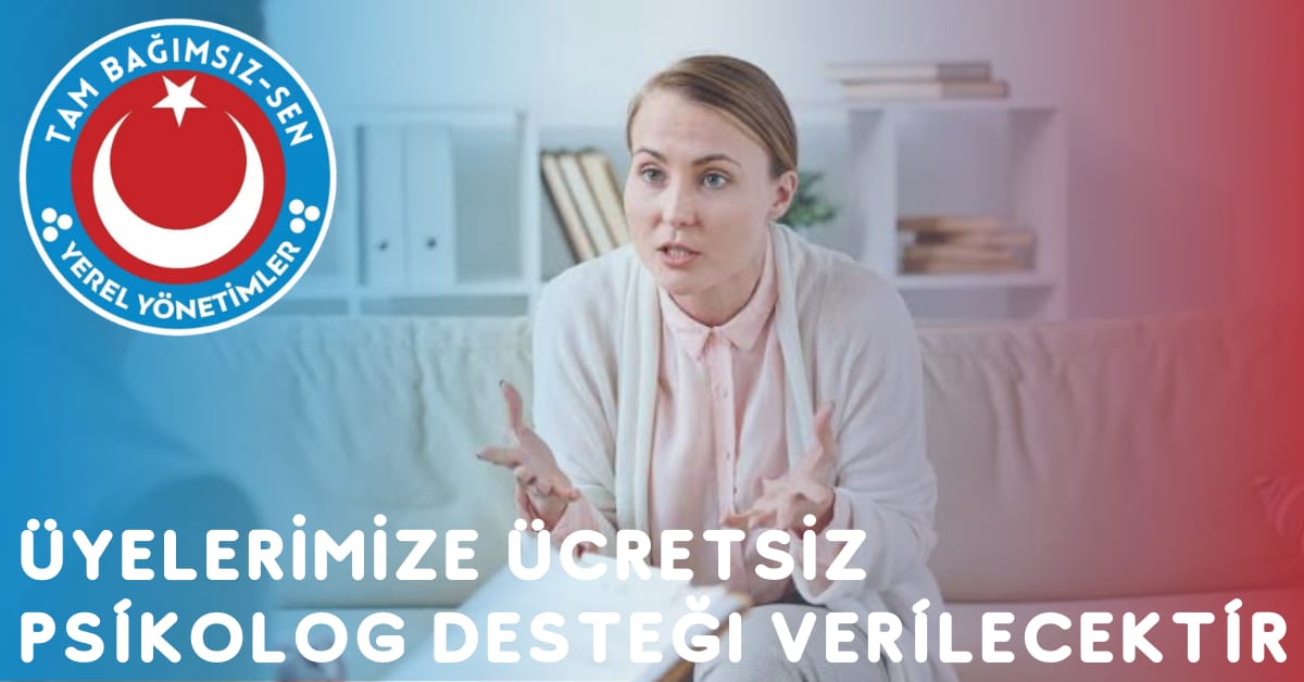 Tam Bağımsız-Sen Yerel Yönetimler, üyelerine ücretsiz psikolog desteği sunmaktadır. Bu hizmet, iş stresi, kişisel sorunlar veya ailevi problemler gibi konularda profesyonel psikolojik destek sağlayarak üyelerimizin mental sağlığını korumayı amaçlar. Üyelerimiz, uzman psikologlardan bireysel danışmanlık alarak daha dengeli ve huzurlu bir yaşam sürebilirler.