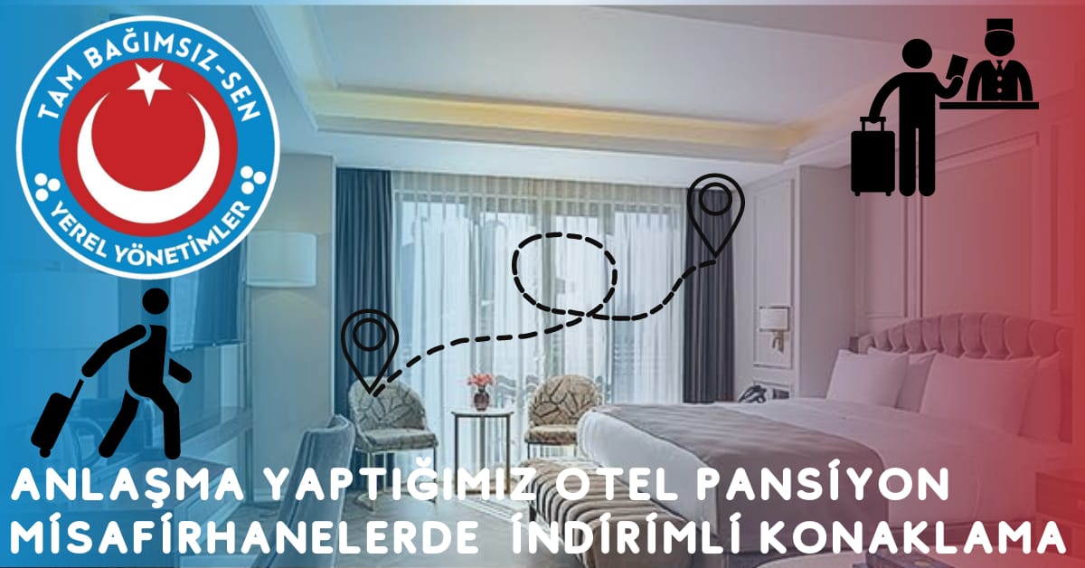 Tam Bağımsız-Sen Yerel Yönetimler, üyelerine indirimli konaklama imkanı sunarak tatil ve dinlenme süreçlerini daha ekonomik hale getirmeyi hedeflemektedir. Anlaşmalı otel ve konaklama tesislerinde sağlanacak indirimler, üyelerimizin seyahatlerini daha uygun fiyatlarla gerçekleştirmelerine olanak tanıyacaktır.